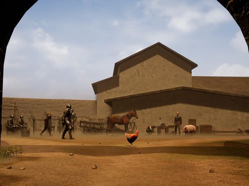 Die Sonne steht tief am Himmel, ein sanfter Wind weht. Einige Krieger sitzen an einer Feuerstelle. Ihre gedämpften Stimmen und das Knistern des Feuers dringen an dein Ohr. Hinter dir erklingen Schleifgeräusche und Pferdewiehern. Du drehst dich und siehst, wie ein Krieger seine Waffe am Schleifstein schärft.